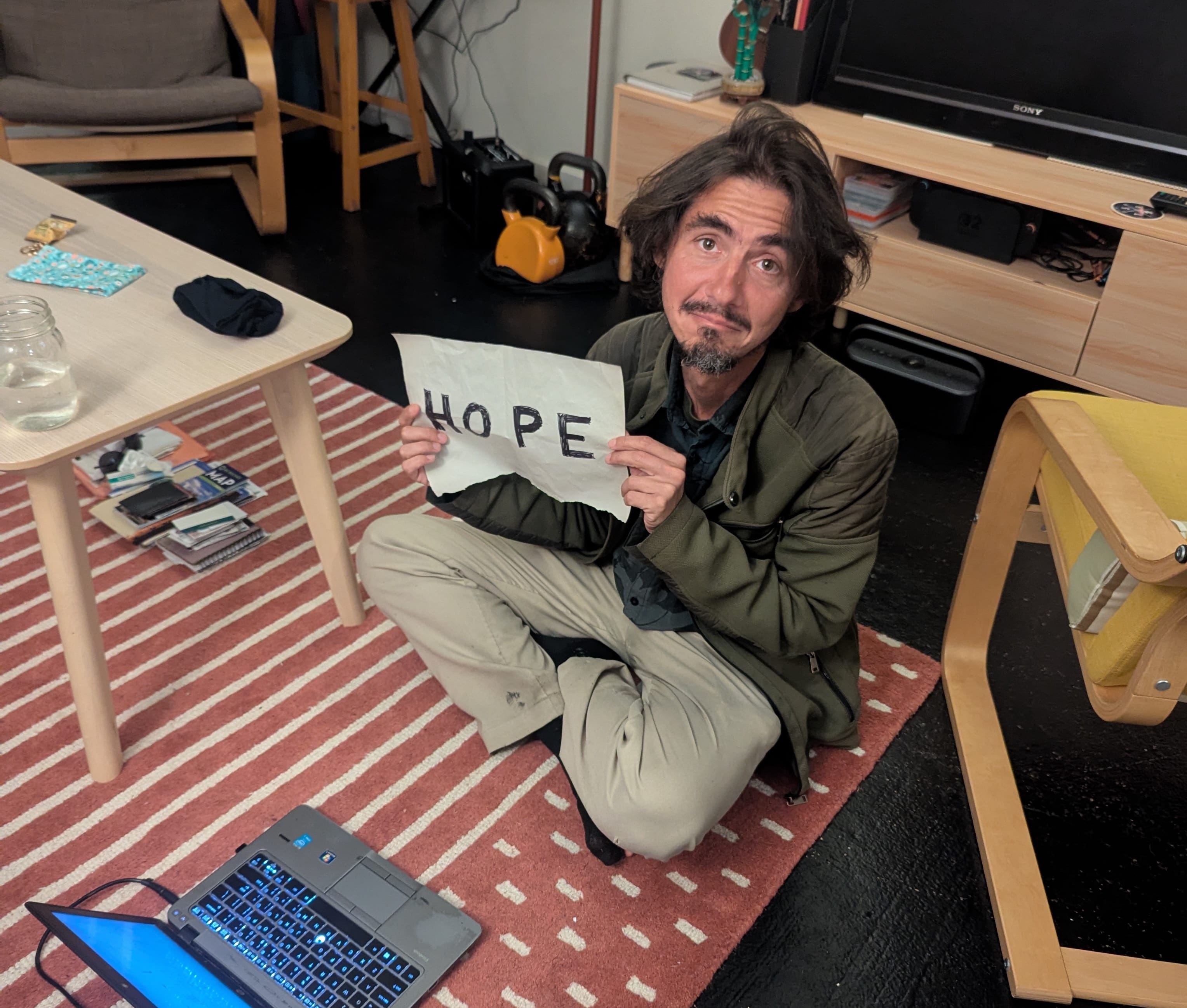 It took me a minute to realize it was his “hitchhiking to Hope, An Actual City In BC” sign. He then showed us a huge stack of papers, each with a city name, that had earned him passage all the way across Canada.